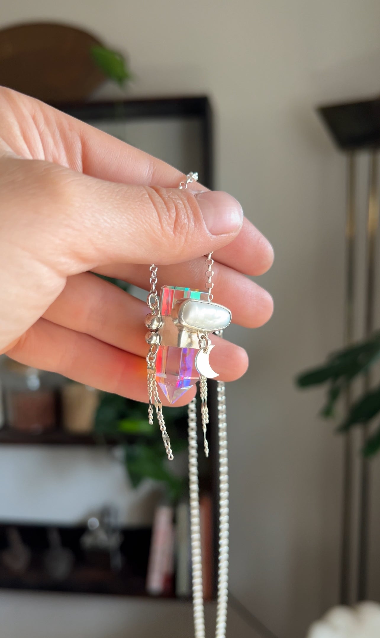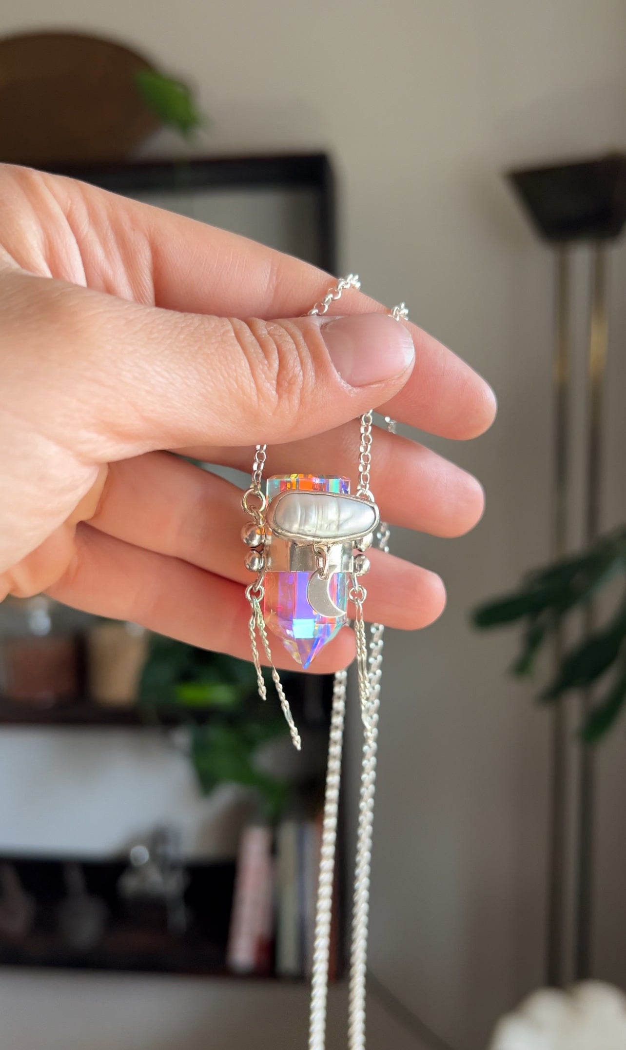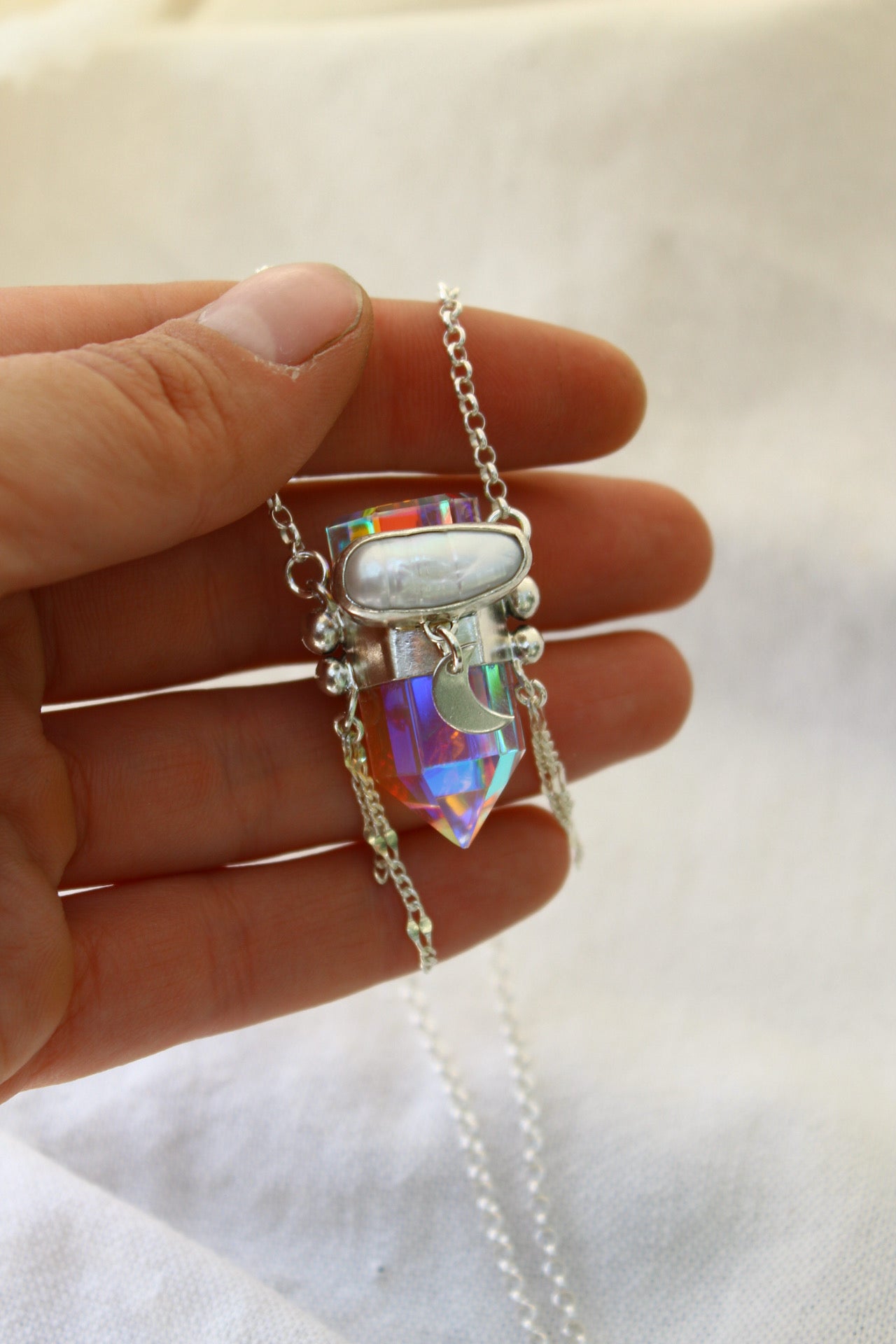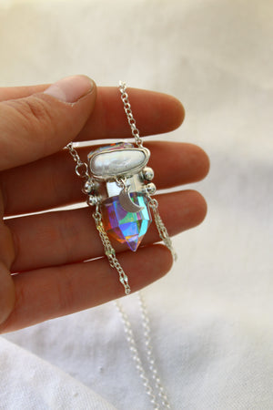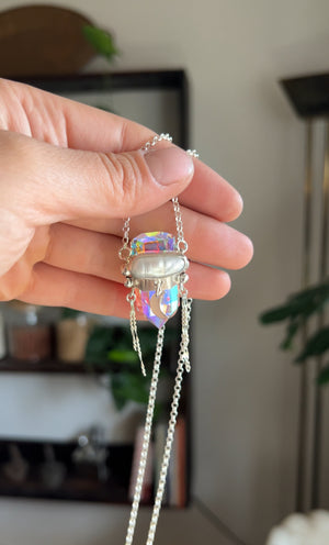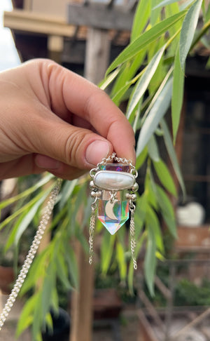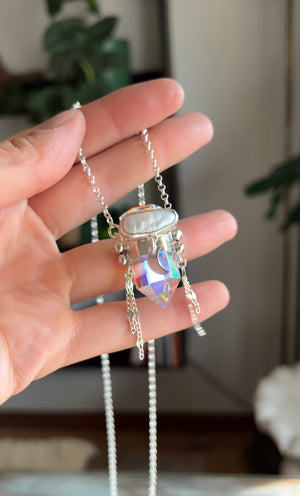 Amuleto hecho a mano en plata 950 con punta de cuarzo místico y una perla de río