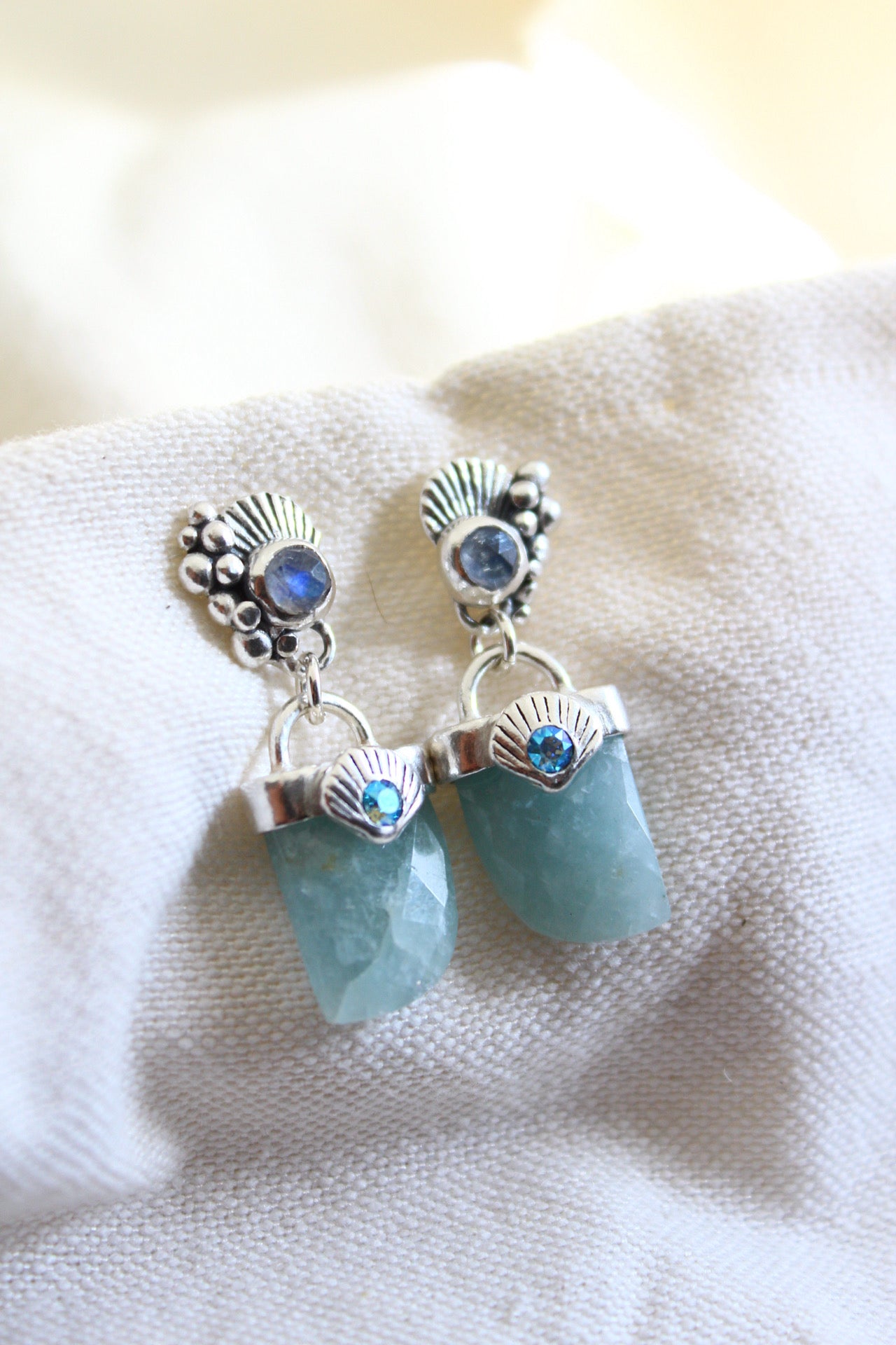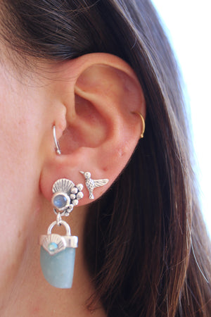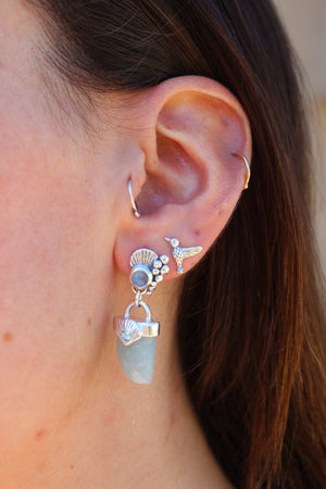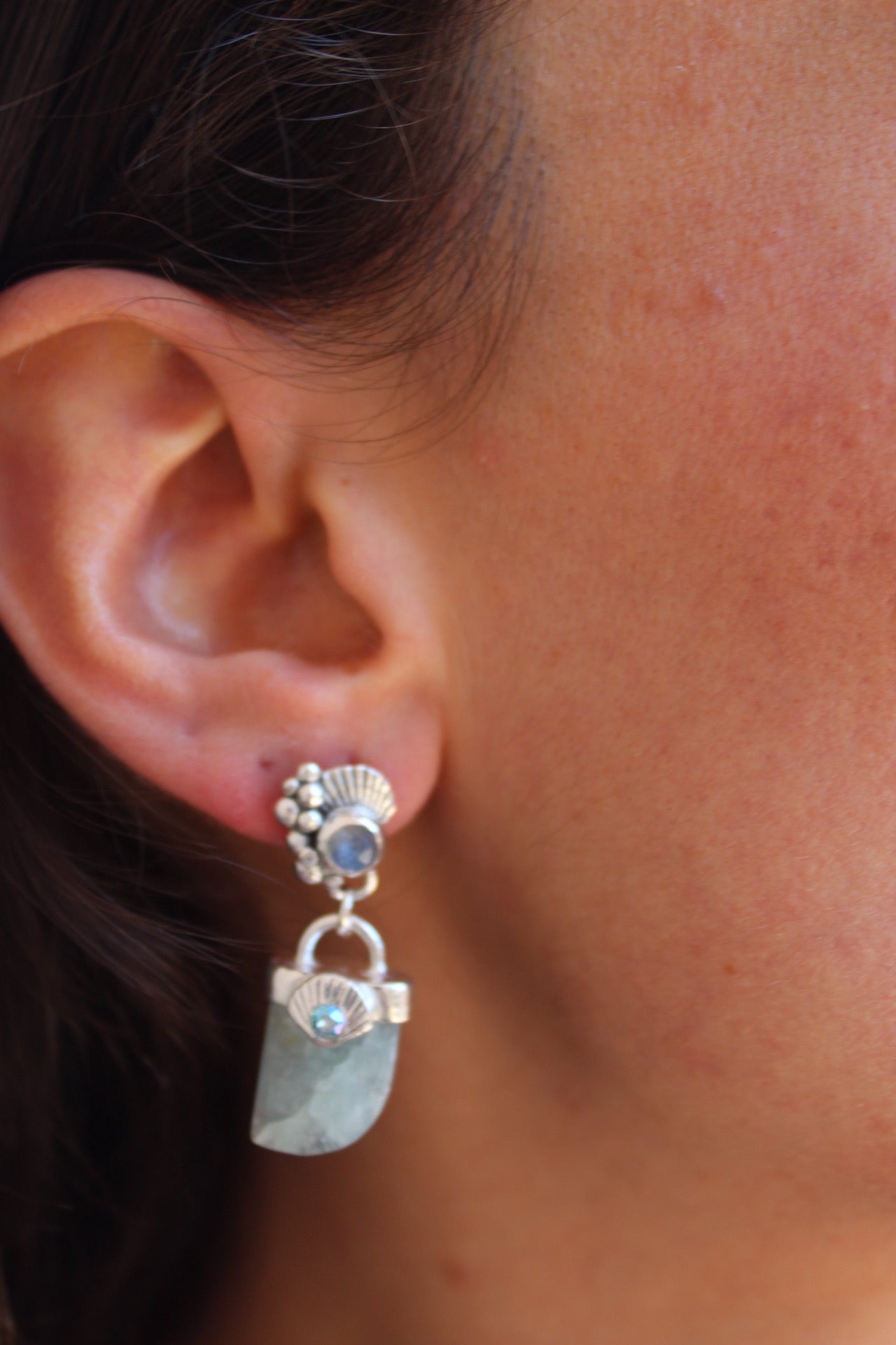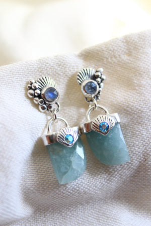 Aros hechos a mano en plata 950 con colmillo de agua marina y piedra luna en la concha