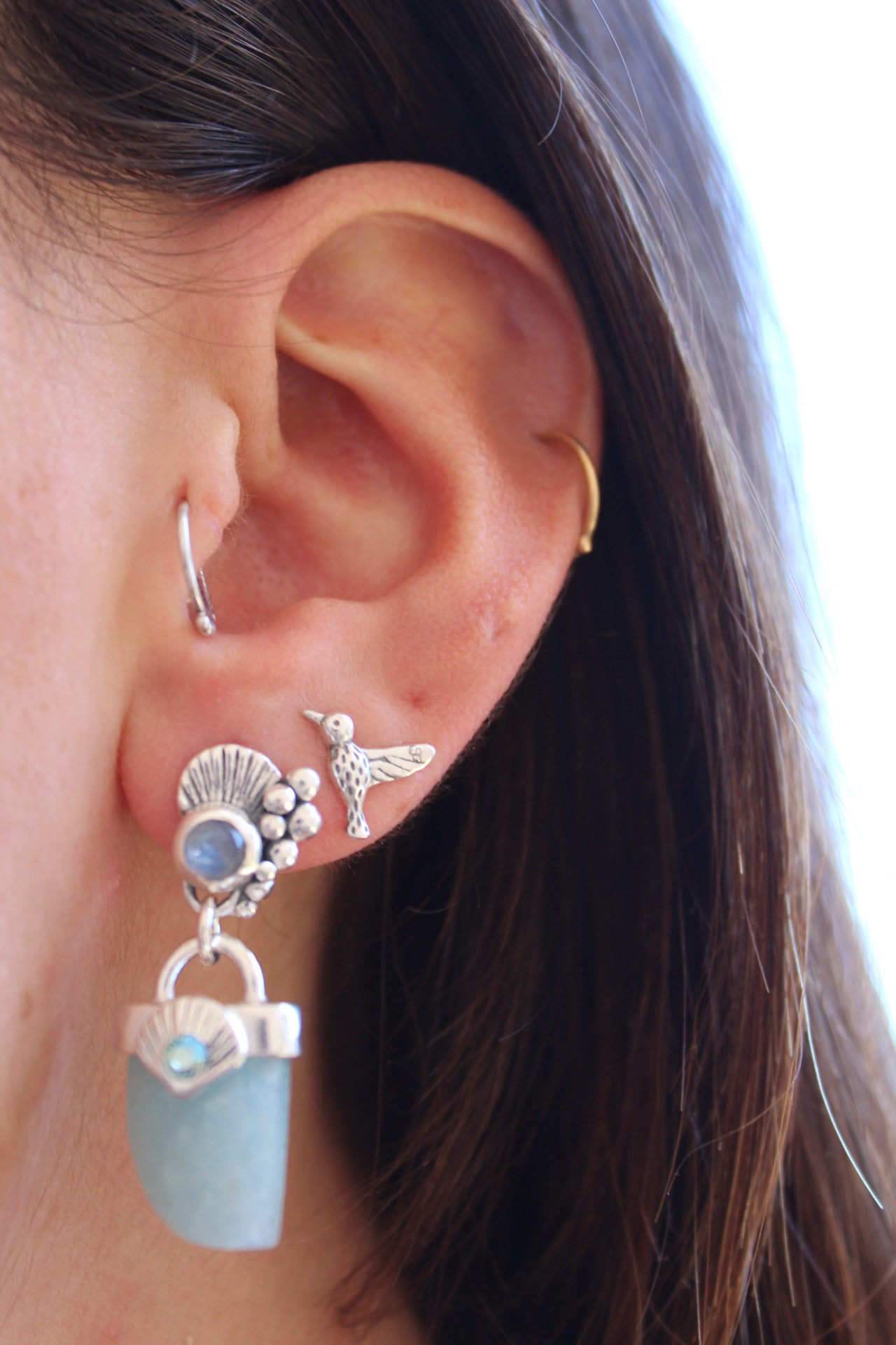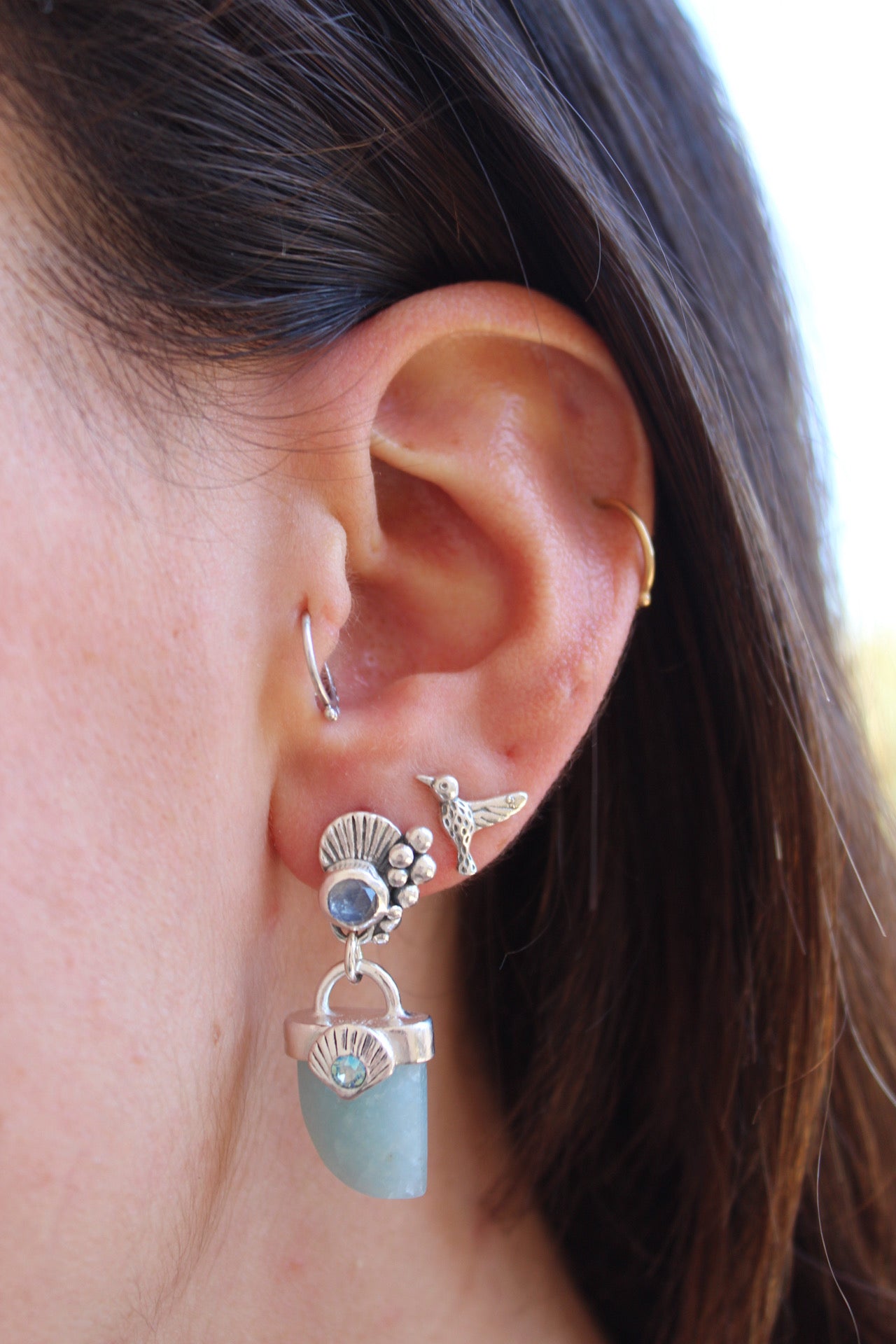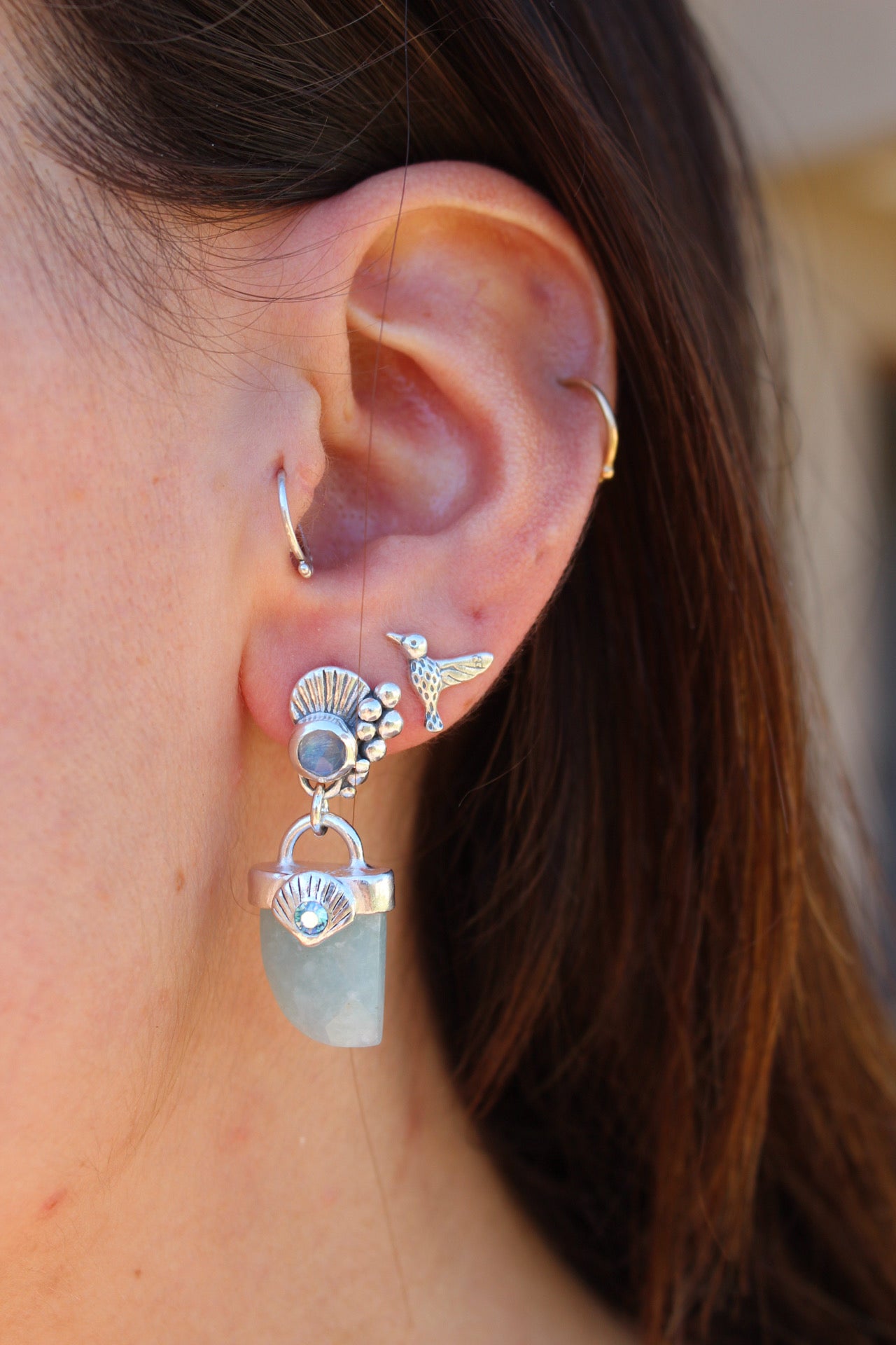 Aros hechos a mano en plata 950 con colmillo de agua marina y piedra luna en la concha