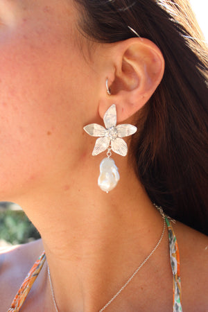 Aros flor tallada a mano en plata 950 tiene un cristal blanco en el centro